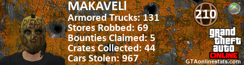 [URL=http://GTAonlinestats.com/showplayer/MAKAVELl][IMG]http://GTAonlinestats.com/randomsignature/MAKAVELl/sig.png[/IMG][/URL]