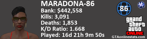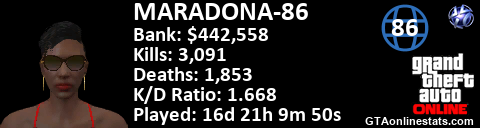 <a href="http://GTAonlinestats.com/showplayer/MARADONA-86"><img src="http://GTAonlinestats.com/randomsignature/MARADONA-86/sig.png" alt="MARADONA-86" border="0" /></a>