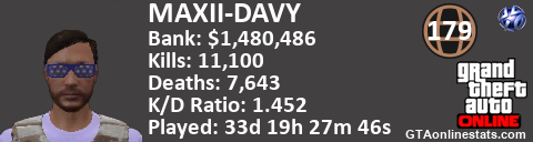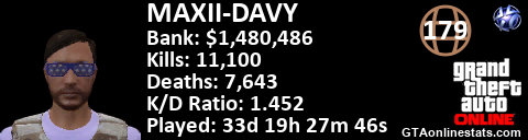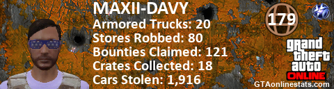 [URL=http://GTAonlinestats.com/showplayer/MAXII-DAVY][IMG]http://GTAonlinestats.com/signature/MAXII-DAVY/sig.png[/IMG][/URL]