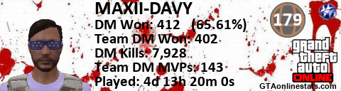 [URL=http://GTAonlinestats.com/showplayer/MAXII-DAVY][IMG]http://GTAonlinestats.com/dmsignature/MAXII-DAVY/sig.png[/IMG][/URL]