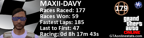 [URL=http://GTAonlinestats.com/showplayer/MAXII-DAVY][IMG]http://GTAonlinestats.com/racesignature/MAXII-DAVY/sig.png[/IMG][/URL]