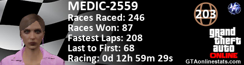 <a href="http://GTAonlinestats.com/showplayer/MEDIC-2559"><img src="http://GTAonlinestats.com/racesignature/MEDIC-2559/sig.png" alt="MEDIC-2559" border="0" /></a>