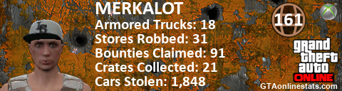 [URL=http://GTAonlinestats.com/showplayer/MERKALOT][IMG]http://GTAonlinestats.com/crimesignature/MERKALOT/sig.png[/IMG][/URL]