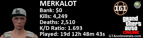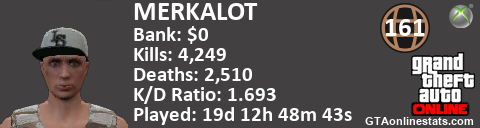 <a href="http://GTAonlinestats.com/showplayer/MERKALOT"><img src="http://GTAonlinestats.com/signature/MERKALOT/sig.png" alt="Merkalot" border="0" /></a>
