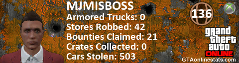<a href="http://GTAonlinestats.com/showplayer/MJMISBOSS"><img src="http://GTAonlinestats.com/crimesignature/MJMISBOSS/sig.png" alt="MJMISBOSS" border="0" /></a>