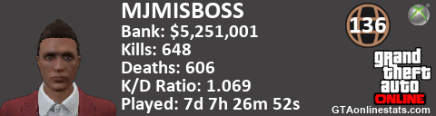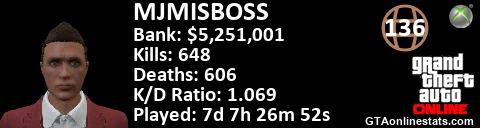 <a href="http://GTAonlinestats.com/showplayer/MJMISBOSS"><img src="http://GTAonlinestats.com/signature/MJMISBOSS/sig.png" alt="MJMISBOSS" border="0" /></a>
