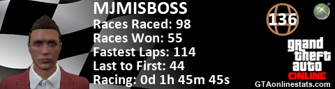 <a href="http://GTAonlinestats.com/showplayer/MJMISBOSS"><img src="http://GTAonlinestats.com/racesignature/MJMISBOSS/sig.png" alt="MJMISBOSS" border="0" /></a>