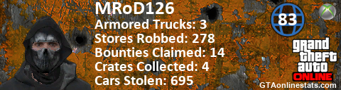 [URL=http://GTAonlinestats.com/showplayer/MRoD126][IMG]http://GTAonlinestats.com/crimesignature/MRoD126/sig.png[/IMG][/URL]