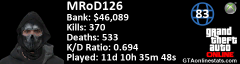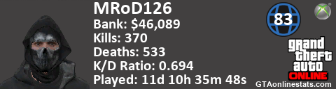 [URL=http://GTAonlinestats.com/showplayer/MRoD126][IMG]http://GTAonlinestats.com/signature/MRoD126/sig.png[/IMG][/URL]