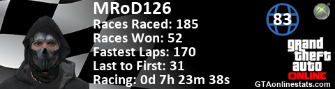 [URL=http://GTAonlinestats.com/showplayer/MRoD126][IMG]http://GTAonlinestats.com/racesignature/MRoD126/sig.png[/IMG][/URL]
