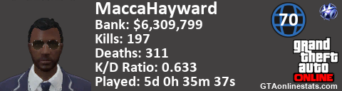 [URL=http://GTAonlinestats.com/showplayer/MaccaHayward][IMG]http://GTAonlinestats.com/greysignature/MaccaHayward/sig.png[/IMG][/URL]