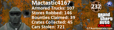 <a href="http://GTAonlinestats.com/showplayer/Mactastic4167"><img src="http://GTAonlinestats.com/randomsignature/Mactastic4167/sig.png" alt="Mactastic4167" border="0" /></a>