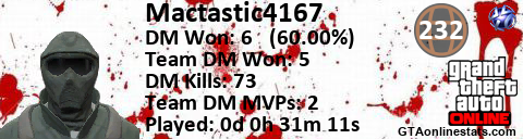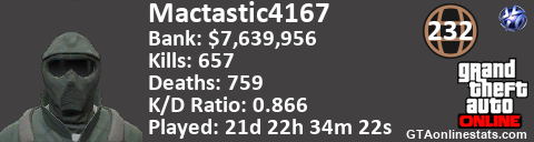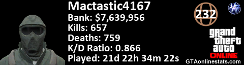 <a href="http://GTAonlinestats.com/showplayer/Mactastic4167"><img src="http://GTAonlinestats.com/dmsignature/Mactastic4167/sig.png" alt="Mactastic4167" border="0" /></a>