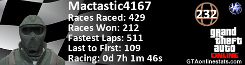 <a href="http://GTAonlinestats.com/showplayer/Mactastic4167"><img src="http://GTAonlinestats.com/racesignature/Mactastic4167/sig.png" alt="Mactastic4167" border="0" /></a>