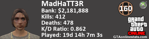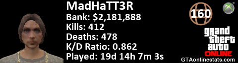<a href="http://GTAonlinestats.com/showplayer/MadHaTT3R"><img src="http://GTAonlinestats.com/signature/MadHaTT3R/sig.png" alt="MadHaTT3R" border="0" /></a>