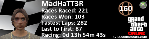 <a href="http://GTAonlinestats.com/showplayer/MadHaTT3R"><img src="http://GTAonlinestats.com/racesignature/MadHaTT3R/sig.png" alt="MadHaTT3R" border="0" /></a>
