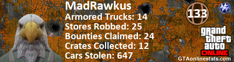 [URL=http://GTAonlinestats.com/showplayer/MadRawkus][IMG]http://GTAonlinestats.com/randomsignature/MadRawkus/sig.png[/IMG][/URL]