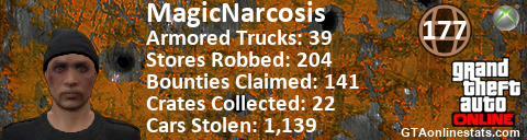 [URL=http://GTAonlinestats.com/showplayer/MagicNarcosis][IMG]http://GTAonlinestats.com/signature/MagicNarcosis/sig.png[/IMG][/URL]