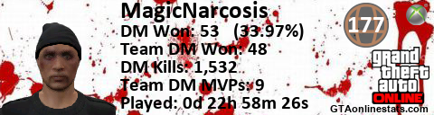 [URL=http://GTAonlinestats.com/showplayer/MagicNarcosis][IMG]http://GTAonlinestats.com/dmsignature/MagicNarcosis/sig.png[/IMG][/URL]