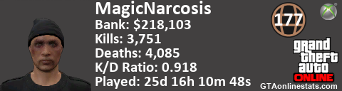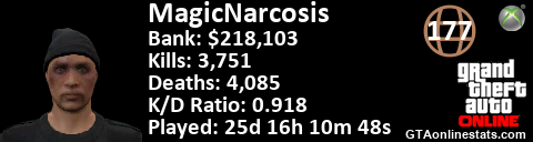 <a href="http://GTAonlinestats.com/showplayer/MagicNarcosis"><img src="http://GTAonlinestats.com/dmsignature/MagicNarcosis/sig.png" alt="MagicNarcosis" border="0" /></a>
