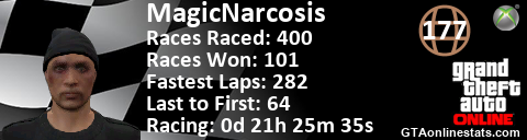 <a href="http://GTAonlinestats.com/showplayer/MagicNarcosis"><img src="http://GTAonlinestats.com/racesignature/MagicNarcosis/sig.png" alt="MagicNarcosis" border="0" /></a>