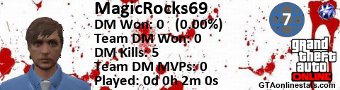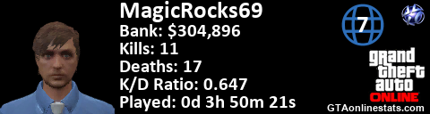 <a href="http://GTAonlinestats.com/showplayer/MagicRocks69"><img src="http://GTAonlinestats.com/dmsignature/MagicRocks69/sig.png" alt="MagicRocks69" border="0" /></a>