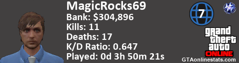 <a href="http://GTAonlinestats.com/showplayer/MagicRocks69"><img src="http://GTAonlinestats.com/randomsignature/MagicRocks69/sig.png" alt="MagicRocks69" border="0" /></a>