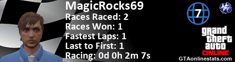 <a href="http://GTAonlinestats.com/showplayer/MagicRocks69"><img src="http://GTAonlinestats.com/racesignature/MagicRocks69/sig.png" alt="MagicRocks69" border="0" /></a>