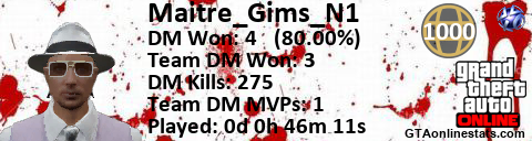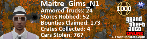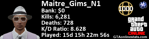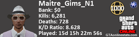 <a href="http://GTAonlinestats.com/showplayer/Maitre_Gims_N1"><img src="http://GTAonlinestats.com/dmsignature/Maitre_Gims_N1/sig.png" alt="Maitre_Gims_N1" border="0" /></a>