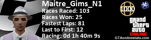 [URL=http://GTAonlinestats.com/showplayer/Maitre_Gims_N1][IMG]http://GTAonlinestats.com/racesignature/Maitre_Gims_N1/sig.png[/IMG][/URL]