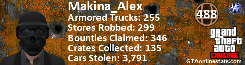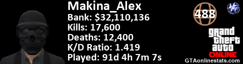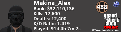 <a href="http://GTAonlinestats.com/showplayer/Makina_Alex"><img src="http://GTAonlinestats.com/randomsignature/Makina_Alex/sig.png" alt="Makina_Alex" border="0" /></a>