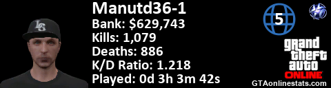 <a href="http://GTAonlinestats.com/showplayer/Manutd36-1/2"><img src="http://GTAonlinestats.com/dmsignature/Manutd36-1/2/sig.png" alt="Manutd36-1" border="0" /></a>