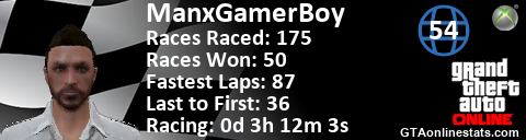 [URL=http://GTAonlinestats.com/showplayer/ManxGamerBoy][IMG]http://GTAonlinestats.com/racesignature/ManxGamerBoy/sig.png[/IMG][/URL]
