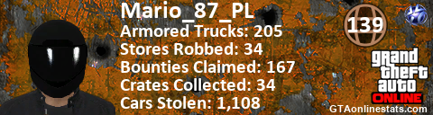 [URL=http://GTAonlinestats.com/showplayer/Mario_87_PL][IMG]http://GTAonlinestats.com/signature/Mario_87_PL/sig.png[/IMG][/URL]