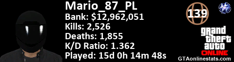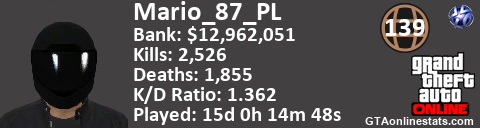 <a href="http://GTAonlinestats.com/showplayer/Mario_87_PL"><img src="http://GTAonlinestats.com/dmsignature/Mario_87_PL/sig.png" alt="Mario_87_PL" border="0" /></a>