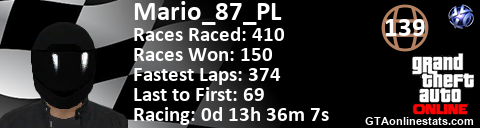 <a href="http://GTAonlinestats.com/showplayer/Mario_87_PL"><img src="http://GTAonlinestats.com/racesignature/Mario_87_PL/sig.png" alt="Mario_87_PL" border="0" /></a>