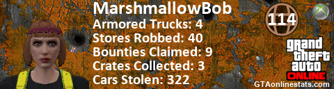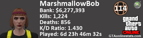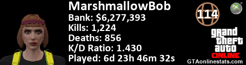 <a href="http://GTAonlinestats.com/showplayer/MarshmallowBob"><img src="http://GTAonlinestats.com/signature/MarshmallowBob/sig.png" alt="MarshmallowBob" border="0" /></a>