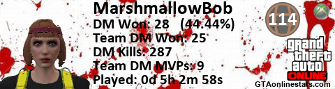 [URL=http://GTAonlinestats.com/showplayer/MarshmallowBob][IMG]http://GTAonlinestats.com/dmsignature/MarshmallowBob/sig.png[/IMG][/URL]