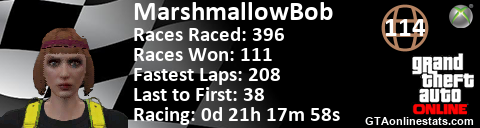<a href="http://GTAonlinestats.com/showplayer/MarshmallowBob"><img src="http://GTAonlinestats.com/racesignature/MarshmallowBob/sig.png" alt="MarshmallowBob" border="0" /></a>