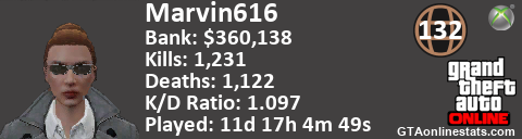 <a href="http://GTAonlinestats.com/showplayer/Marvin616/2"><img src="http://GTAonlinestats.com/dmsignature/Marvin616/2/sig.png" alt="Marvin616" border="0" /></a>