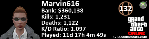 [URL=http://GTAonlinestats.com/showplayer/Marvin616/2][IMG]http://GTAonlinestats.com/signature/Marvin616/2/sig.png[/IMG][/URL]