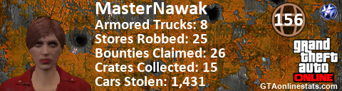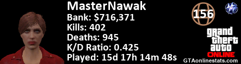 [URL=http://GTAonlinestats.com/showplayer/MasterNawak][IMG]http://GTAonlinestats.com/randomsignature/MasterNawak/sig.png[/IMG][/URL]