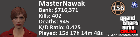 <a href="http://GTAonlinestats.com/showplayer/MasterNawak"><img src="http://GTAonlinestats.com/signature/MasterNawak/sig.png" alt="MasterNawak" border="0" /></a>