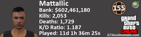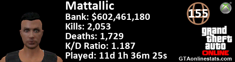[URL=http://GTAonlinestats.com/showplayer/Mattallic][IMG]http://GTAonlinestats.com/signature/Mattallic/sig.png[/IMG][/URL]