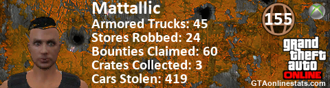 [URL=http://GTAonlinestats.com/showplayer/Mattallic][IMG]http://GTAonlinestats.com/crimesignature/Mattallic/sig.png[/IMG][/URL]