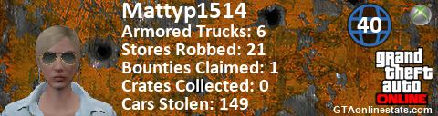 [URL=http://GTAonlinestats.com/showplayer/Mattyp1514/2][IMG]http://GTAonlinestats.com/crimesignature/Mattyp1514/2/sig.png[/IMG][/URL]