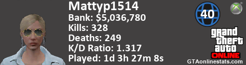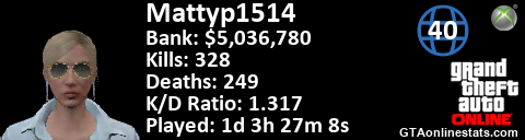 [URL=http://GTAonlinestats.com/showplayer/Mattyp1514/2][IMG]http://GTAonlinestats.com/signature/Mattyp1514/2/sig.png[/IMG][/URL]