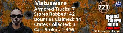 [URL=http://GTAonlinestats.com/showplayer/Matusware][IMG]http://GTAonlinestats.com/signature/Matusware/sig.png[/IMG][/URL]