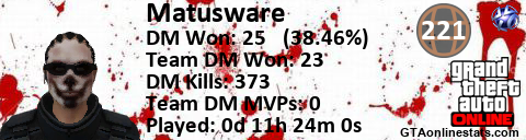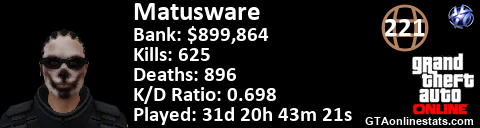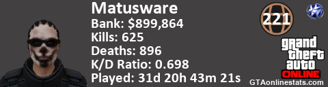 <a href="http://GTAonlinestats.com/showplayer/Matusware"><img src="http://GTAonlinestats.com/dmsignature/Matusware/sig.png" alt="Matusware" border="0" /></a>