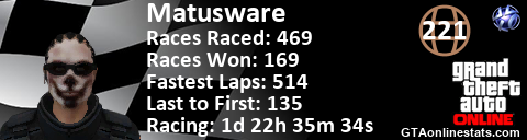 <a href="http://GTAonlinestats.com/showplayer/Matusware"><img src="http://GTAonlinestats.com/racesignature/Matusware/sig.png" alt="Matusware" border="0" /></a>